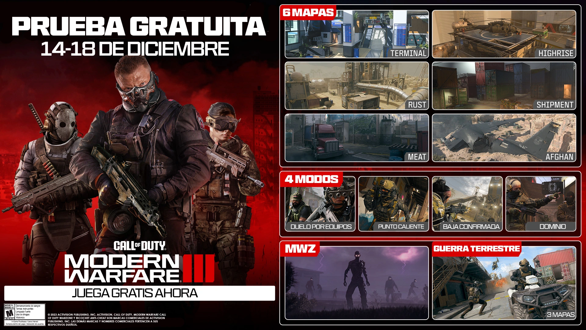 No pierdas la oportunidad de sumergirte en la acción de Modern Warfare III sin costo alguno desde el 14 hasta el 18 de diciembre, con acceso completo a la Temporada 1, incluyendo mapas, modos y nuevas experiencias de juego.