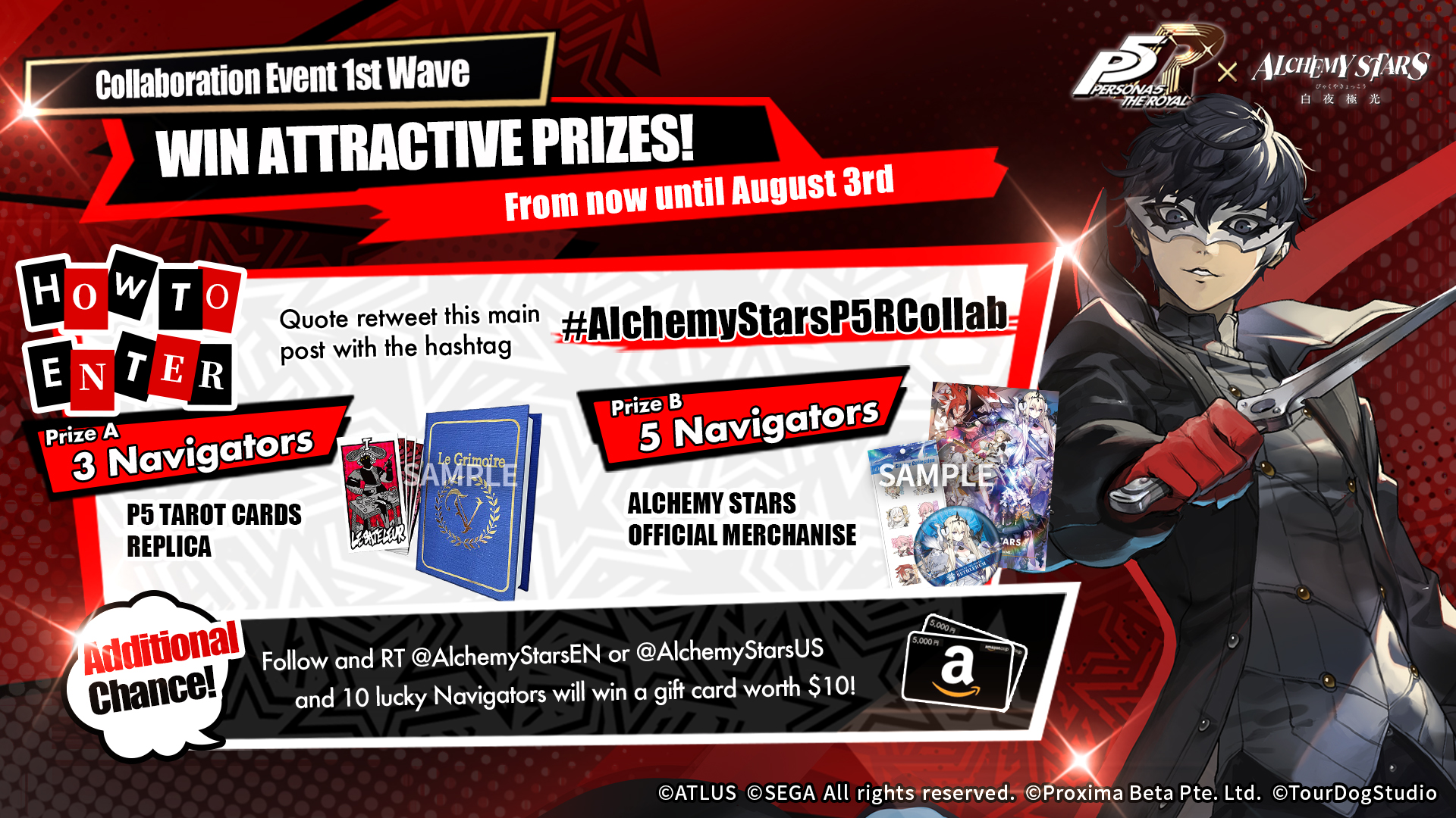 Finalmente se revela que los personajes de la IP creada por ATLUS para este crossover a llevarse a cabo del 14 de Julio al 3 de Agosto serán: Joker, Fox, Queen, Violet y Morgana. Los jugadores acompañaran la travesía de los famosos ladrones de corazones a través de este abstracto y alquímico mundo en un evento de historia especial, y vivir al máximo esta esperada colaboración. Muchos plot twists y sucesos inesperados esperarán a la vuelta de la esquina. ¿Crees tener lo suficiente para vivir esta próxima historia?; descúbrelo por ti mismo cuando los Phantom Thieves aterricen en Alchemy Stars, y cruces caminos con ellos en el corazón de Umbraton, con la Luna y su luz como único testigo de este choque de universos.