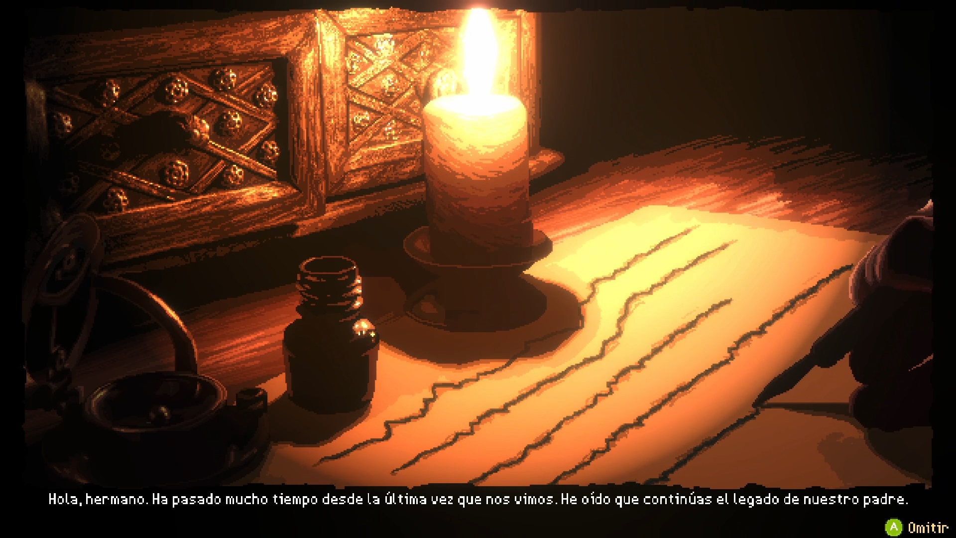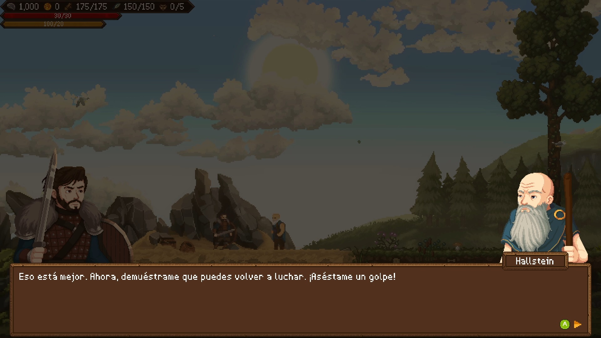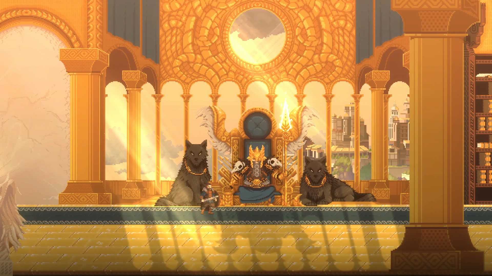 Emplean un pixel art bastante detallado en los retratos de la narrativa, los escenarios y también de los personajes. Su paleta de colores permite resaltar el contraste que hay entre los 2 únicos entornos que tiene la demo. Tonos claros y relucientes para el Valhala, lugar donde habitan los dioses nórdicos. Por otra parte, un toque menos colorido, más sombrío, pero igualmente cuidado y más variado. Las cinemáticas relucen más la belleza de su dirección artística.