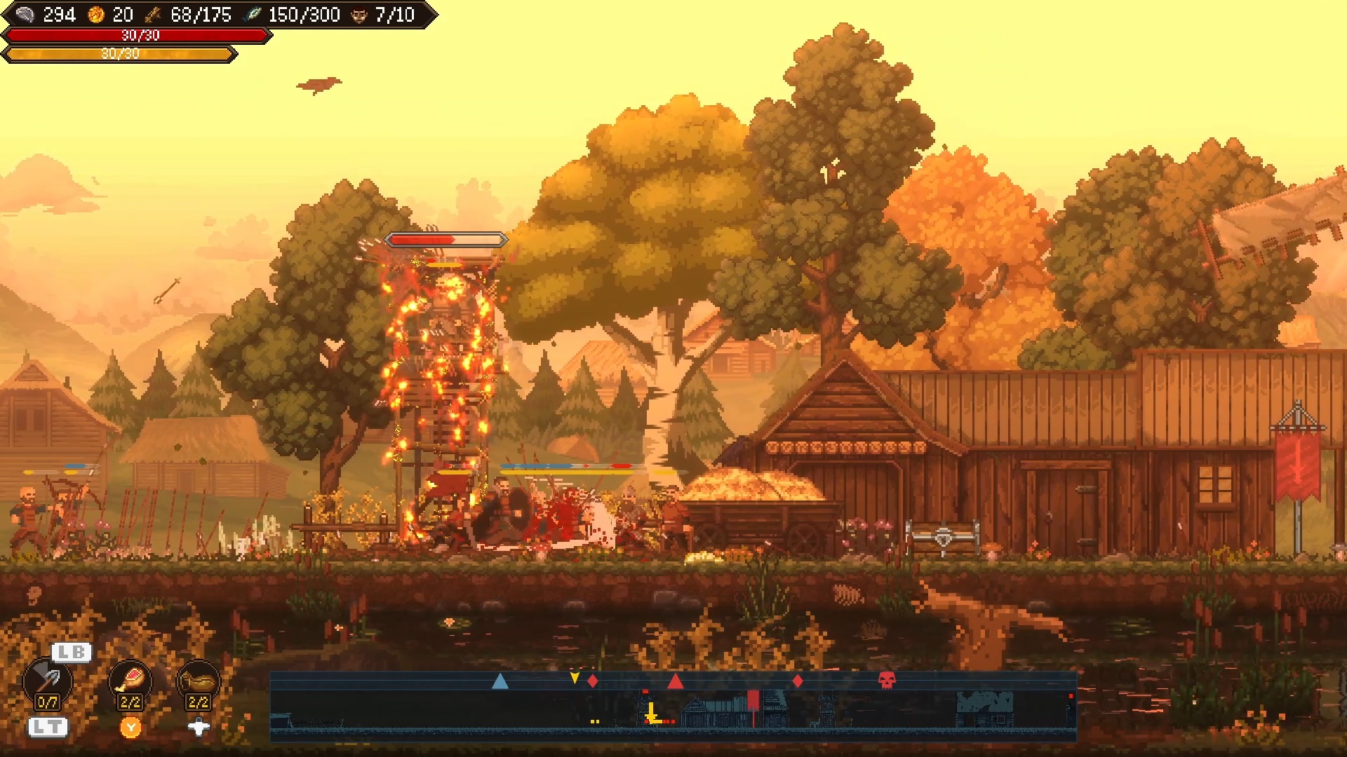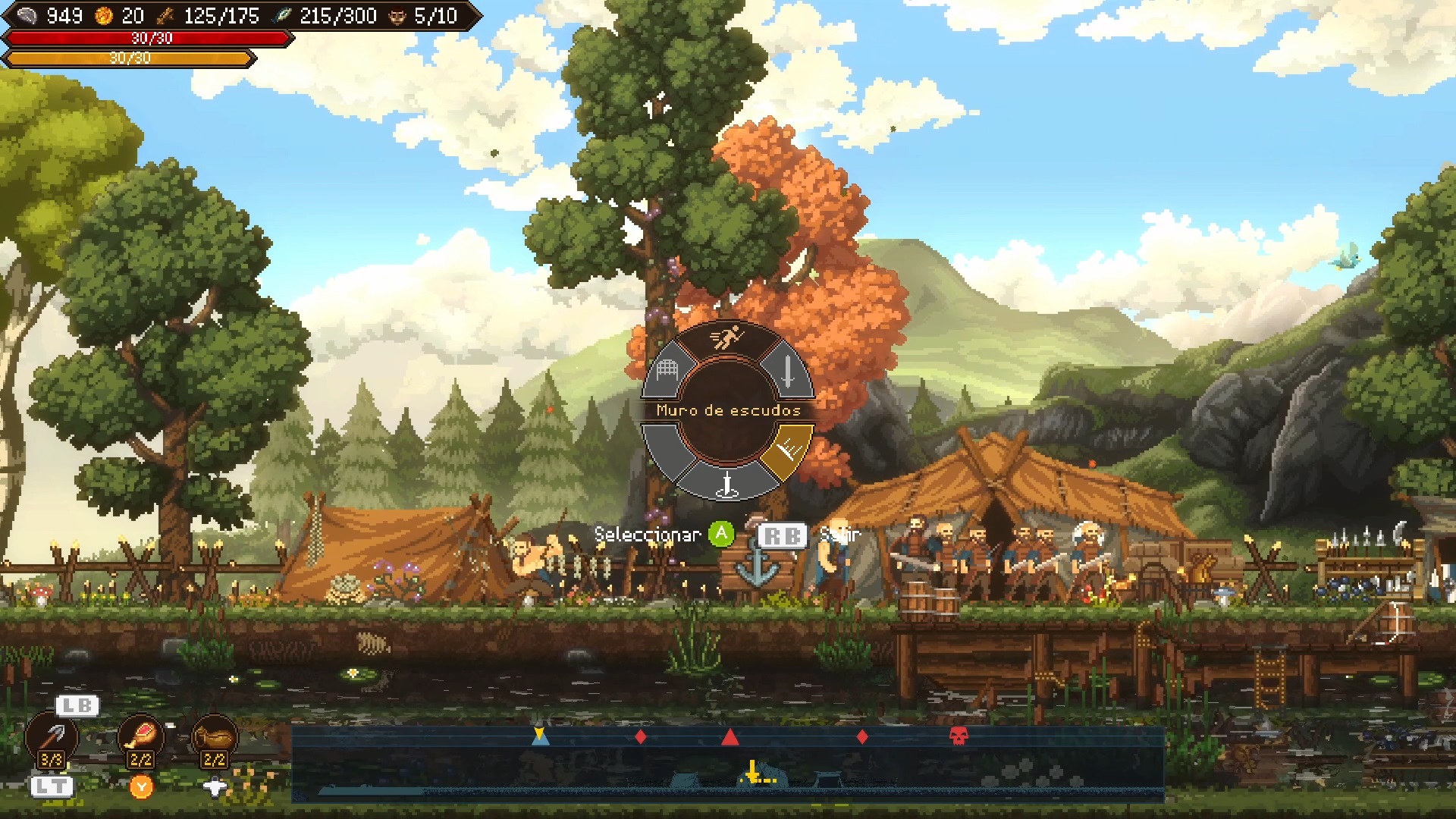 Sons of Valhalla Demo propone un sistema de combate 2D mezclado con gestión de ciudades con scroll lateral. Una fórmula que toma algunos elementos del RTS para entrenar unidades, mejorar tu base y controlar territorio enemigo. Tienes un cinturón en el cual puedes colocar runas, siempre que tengas los espacios para alojarlas. Estas ofrecen una serie de mejoras que se adecuan a diversas formas de juego, con muchas posibilidades jugables. Si llegas a morir, entonces vas a tener que dar una de las runas que hayas conseguido para poder resucitar. Dicho cinturón es ampliable con cierto material, otorgando una ranura extra para las runas que consigues.