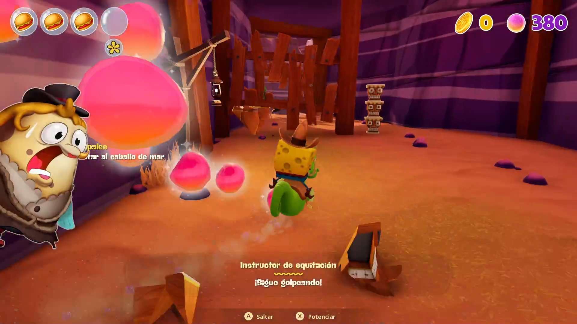 Bob Esponja: The Cosmic Shake es un plataformero que no tarda en empezar tras abandonar la pantalla de título. Ni bien inicias, ya estás en control de nuestro simpático personaje capaz de atacar, esquivar, planear, saltar y disparar burbujas. Pero esto sería un repertorio básico para la gran movilidad que tiene, junto a algunas habilidades específicas. Estas surgen en base al nivel que estamos recorriendo, además de ir emparejadas con la temática que tienen. Una de ellas, a modo de ejemplo, está en montar a caballo para conseguir la tan ansiada licencia de conducir. Por lo cual se da una sección donde podemos pasar una corta, pero más que divertida pista de obstáculos.