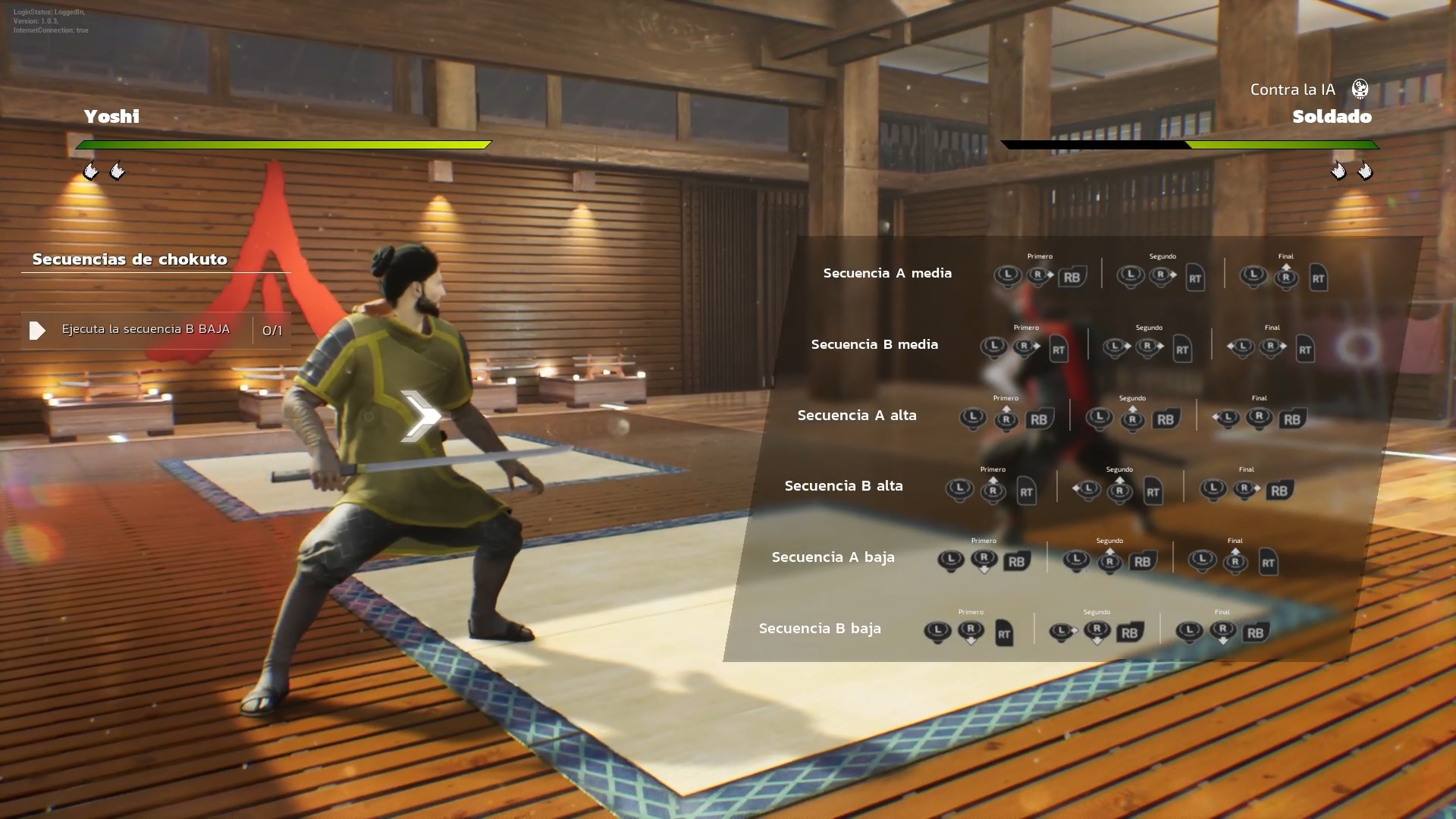 De aquí partimos al tutorial que te enseña las bases del juego y como usar las diferentes armas a disposición. Podremos controlar nuestro personaje para guiarlo hacia una de las prácticas disponibles. Una vez seleccionada, pasaremos al dojo donde practicaremos el tema seleccionado y al terminar estaremos de vuelta en el salón. Me gusta el aspecto interactivo, salvo la lentitud del personaje para seleccionar una práctica y quizás un menú será más funcional. También hay entrenamiento para mejorar nuestras aptitudes junto al desafío, el cual es sobrevivir tantos duelos como puedas.