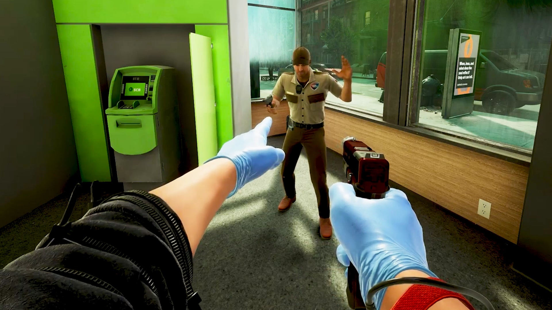 Pasemos a lo interesante de esta entrega, la forma de abordar los atracos. En general tiene un ritmo más realista, responsivo y fluido cuando controlamos a nuestro personaje. Tenemos la opción de abrir cerraduras sin necesidad de la máscara, lidiar con cajas fuertes e interactuar con objetos útiles. Aunque esto me lleva a notar algunas incoherencias, como romper un cierre sin máscara, pero debes ponértela si quieres entrar. Hay zonas tanto públicas como privadas vigiladas por policías, que son los únicos que notarán si hacemos cosas raras. Si nos cachan en un área privada nos escoltarán y si no hacemos caso, terminaremos en arresto. Entre los atracos que realizamos tendremos ilustraciones que sirven a modo de campaña.