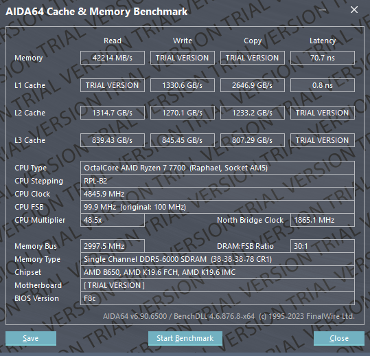 Las pruebas se realizaron en una sola modalidad, la velocidad con el perfil XMP aplicado. No contamos con otras memorias similares para compararlas, por lo que usaremos los resultados de la anterior reseña. Las T-Force Delta TUF Gaming RGB para DDR4 con su perfil XMP aplicado a 3200 serán el rival en la comparativa. La plataforma de pruebas emplea el socket AM5 y se encuentra con su actualización de BIOS más reciente.