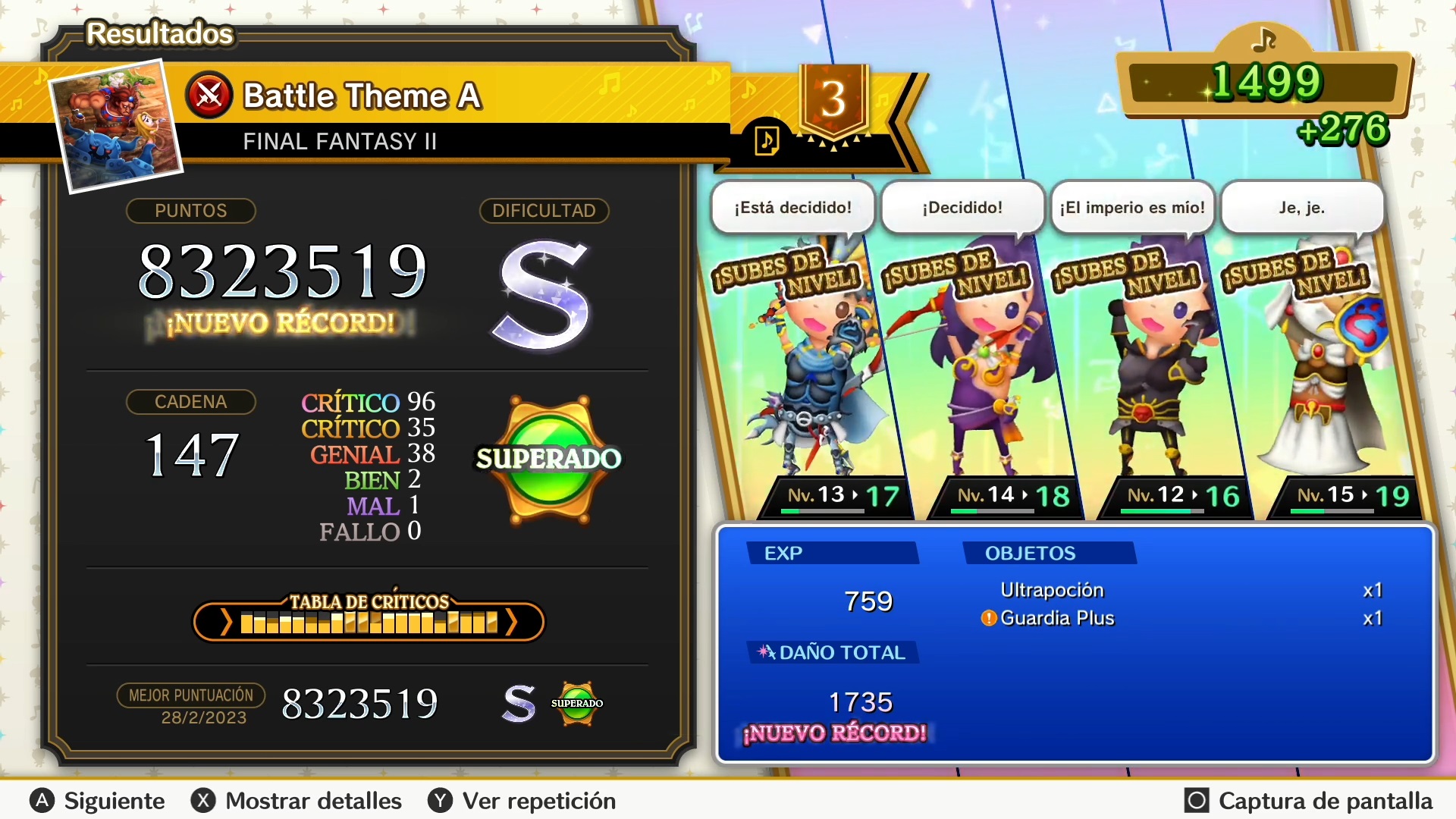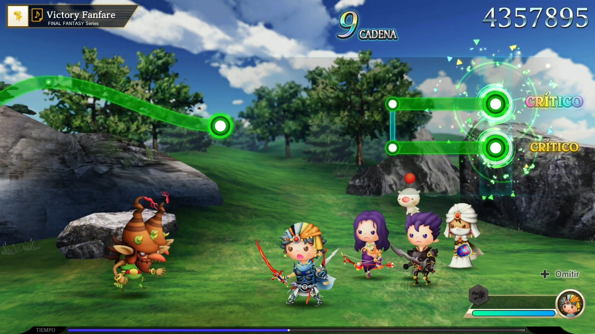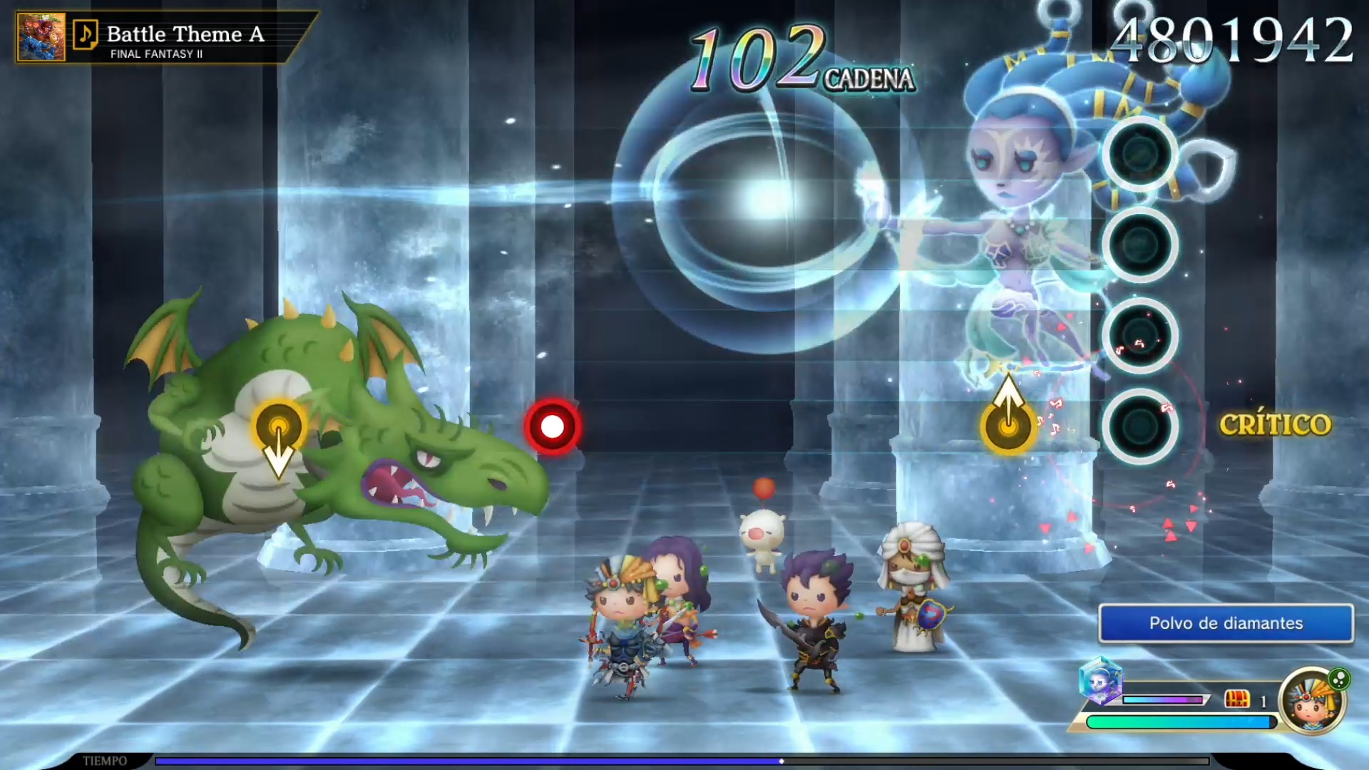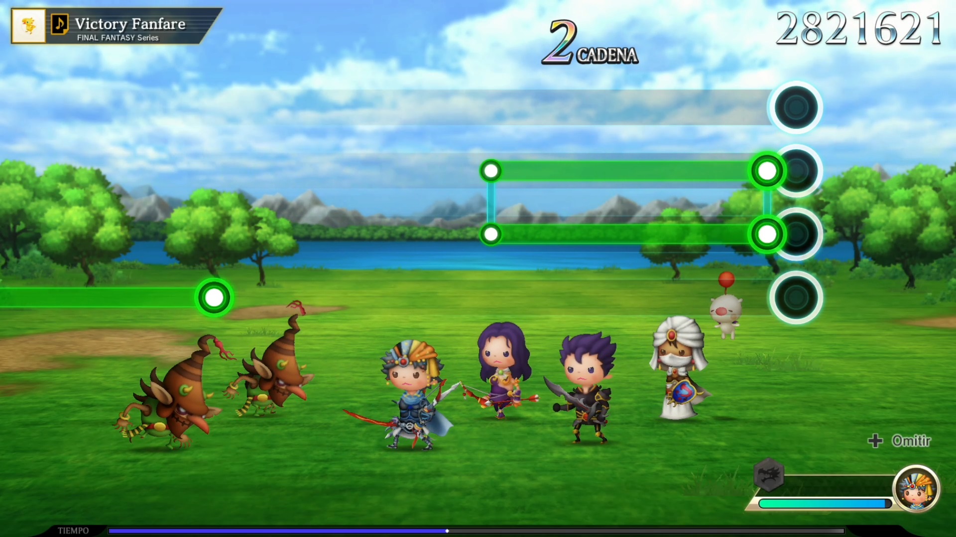 Pero la cosa no termina aquí, añadieron un componente de rol a la fórmula en el modo historia. Revives la historia de cada juego al mismo tiempo que escuchas varios de sus temas más emblemáticos. Al fondo se desata una batalla encarnizada que rememora a su modo un evento diferente de cada juego. Esto se muestra como una progresión lineal por fases, cada una marcada con su propia tanta de enemigos. Contamos con temas de batalla, los de campo con tonadas más suaves y los de eventos que recrean momentos icónicos. Aquí las notan bajan de arriba hacia abajo en vez de estar colocadas horizontalmente.