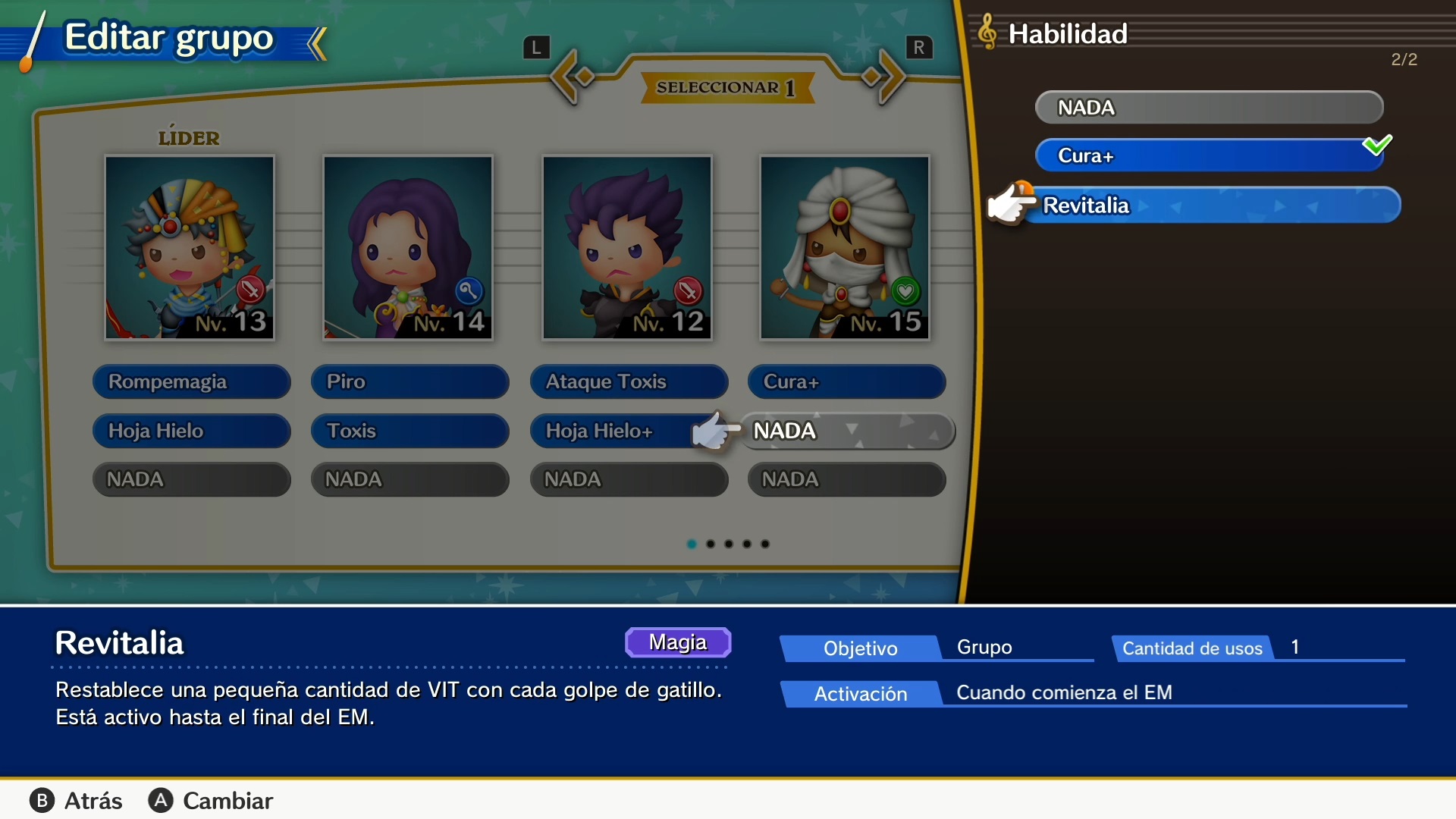 Los escenarios pueden traer alteraciones que afectan el desempeño de los protagonistas, sin importar si tocas magistralmente. Aquí es donde añaden un ligero componente de RPG a la fórmula, ya que puedes equiparlos o modificar el grupo. Quizás sea una batalla que necesite alguien que cure, tal vez necesites puro daño o algo mixto. Se le soma la dificultad de la partitura, la cual puedes cambiar antes de empezar cada combate. Recomiendo empezar con la normal, porque incluso el siguiente nivel supone un cambio de velocidad y aumento de notas desafiante.