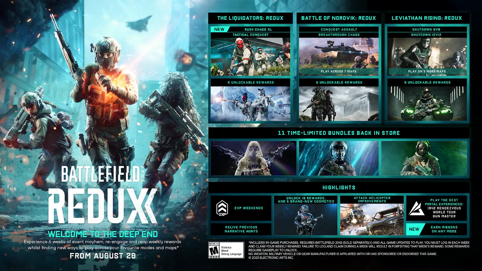 Durante seis semanas a partir del 29 de agosto, Battlefield 2042: Redux ofrecerá a los jugadores la oportunidad de reconectar y obtener recompensas semanales. Los usuarios encontrarán nuevas formas de jugar a través de sus mapas y modos de juego preferidos, incluyendo Rush Chaos XL, Conquista Táctica, Caos Total, Asalto Conquista y Apagón, así como una infinidad de caos al más puro estilo de Battlefield.