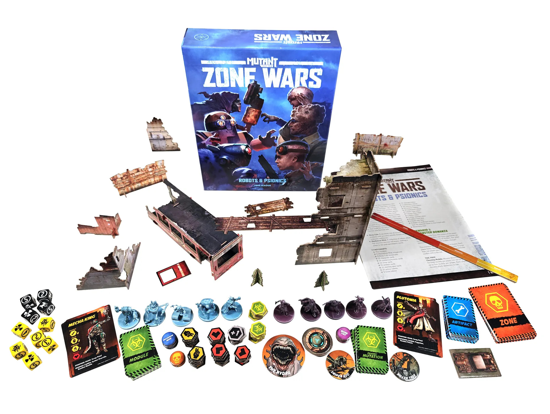 El set básico de Mutant Year Zero: Zone Wars incluye todo lo necesario para dos jugadores: diez miniaturas detalladas de 32 mm (cinco para los Ark Mutants y cinco para la Genlab Tribe), cartas, fichas, dados, un tapete de juego, terreno de cartón, una regla y un libro de reglas que incluye cinco escenarios completos, reglas de campaña, generación de personajes y reglas para juego en solitario.