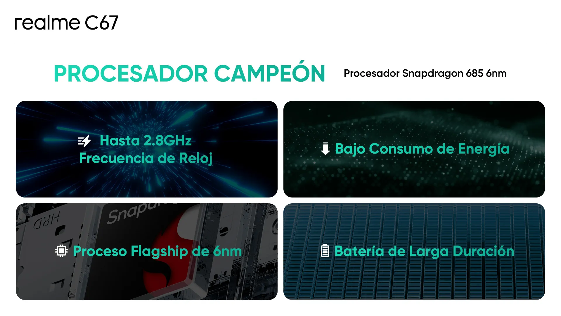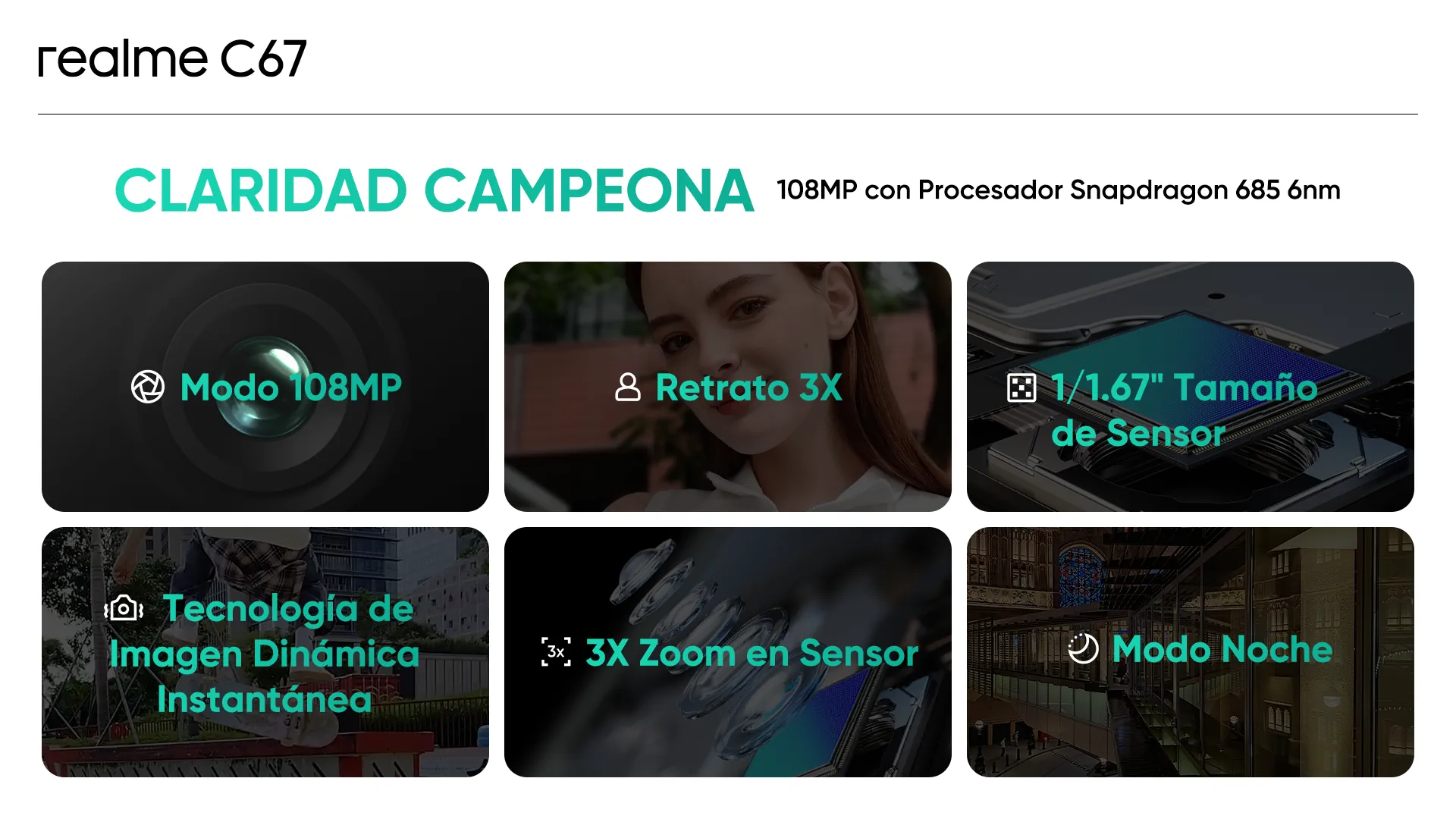 El realme C67 se destaca en cuatro áreas clave: Cámara, Rendimiento, Diseño y Experiencia. Su impresionante cámara de 108MP+ ofrece una calidad de imagen excepcional, mientras que el chipset Snapdragon 685 garantiza un rendimiento suave y estable. Además, su diseño elegante y su experiencia de usuario mejorada lo convierten en una opción ideal para usuarios jóvenes y exigentes.