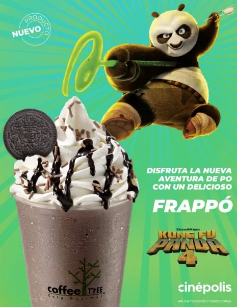 Y como parte del estreno de Kung Fu Panda 4, no te pierdas el Frappó sabor Cookies and Cream en Coffee Tree. Disfruta de esta deliciosa bebida mientras acompañas a Po y sus amigos en sus nuevas aventuras. Coffee Tree ofrece una amplia variedad de crepas, bebidas frías y calientes, y ahora, el irresistible Frappó sabor Cookies and Cream.