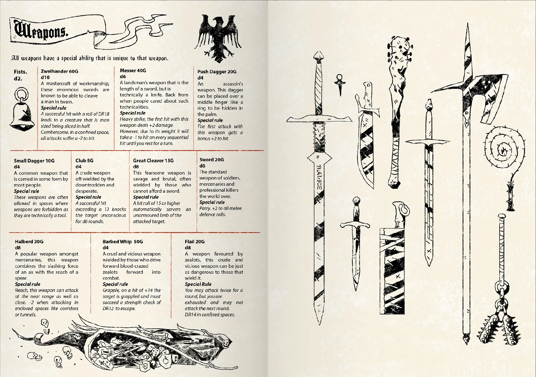 Empuña armas únicas y características, cada una con sus propias reglas y ventajas además del dado de daño. El arsenal incluye las temidas armas de Pólvora Negra. Dispositivos infernales que ignoran toda armadura al golpear y pueden causar tanto caos y destrucción al portador como al objetivo previsto.