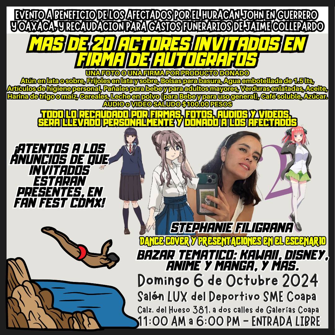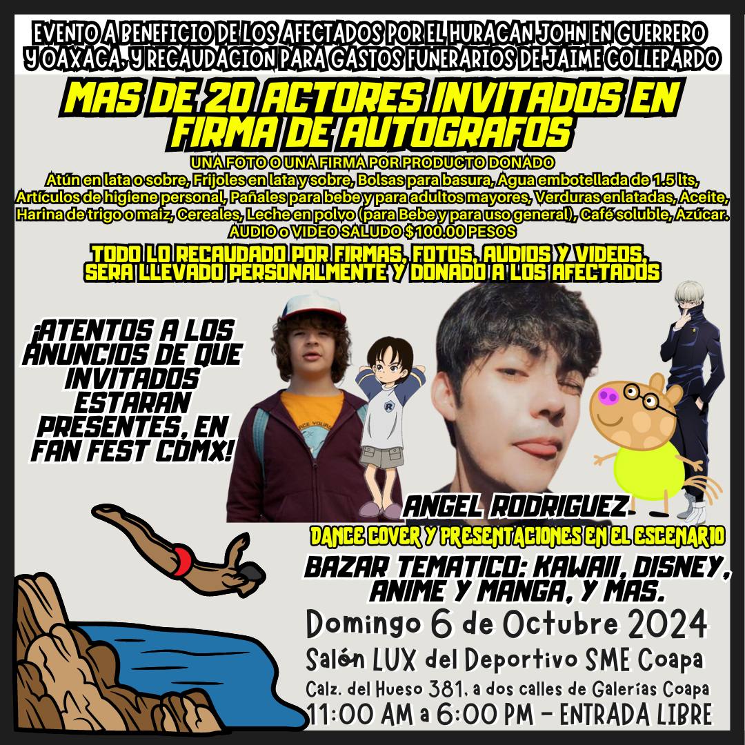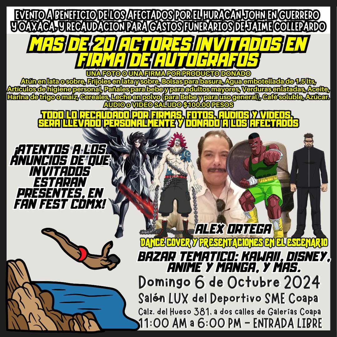 En un acto de solidaridad, Fan Fest CDMX y La Familia del Doblaje organizan un evento especial con el objetivo de recaudar fondos para los afectados por el huracán John en Guerrero y Oaxaca, así como para cubrir los gastos funerarios del querido actor de doblaje Jaime Collepardo. Este evento, que se llevará a cabo el domingo 6 de octubre de 2024 en el Salón LUX del Deportivo SME Coapa, será una experiencia única donde el talento de más de 20 actores de doblaje se hará presente en un ambiente familiar y solidario.