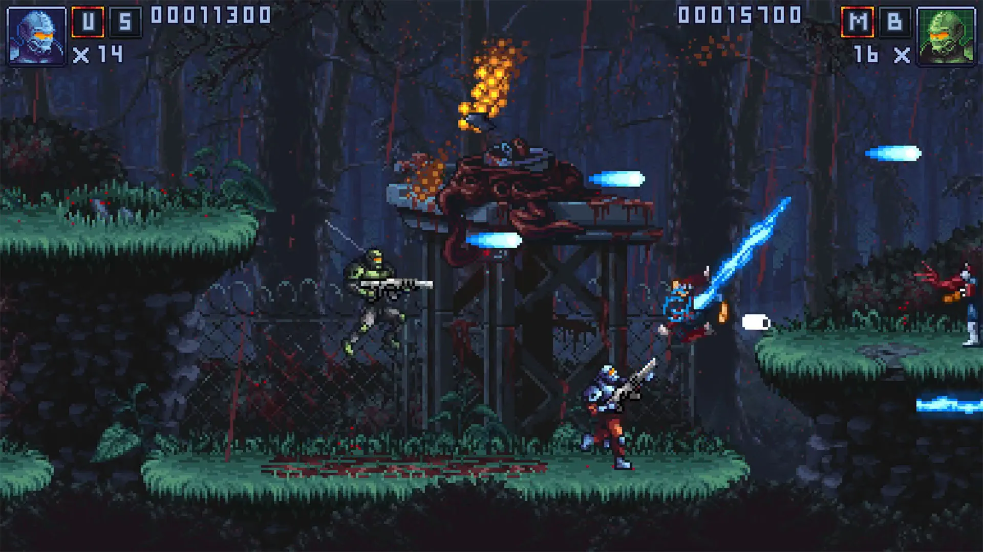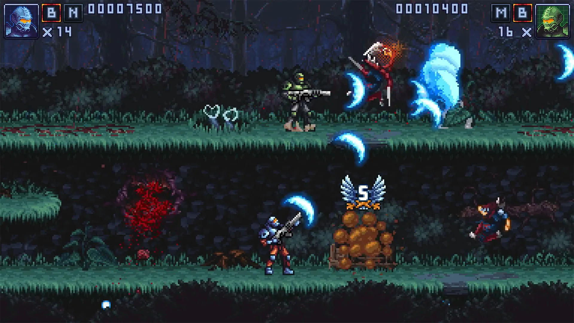 Una de las características más emocionantes es el modo cooperativo local para dos jugadores, permitiendo que un amigo se una a la carnicería y dupliquen el poder de fuego. A medida que avanzas, puedes desbloquear más de 30 skins con partes intercambiables, brindando infinitas opciones de personalización. ¿Un robot con cabeza de tiburón o un híbrido de humano y perro? ¡La elección es tuya!