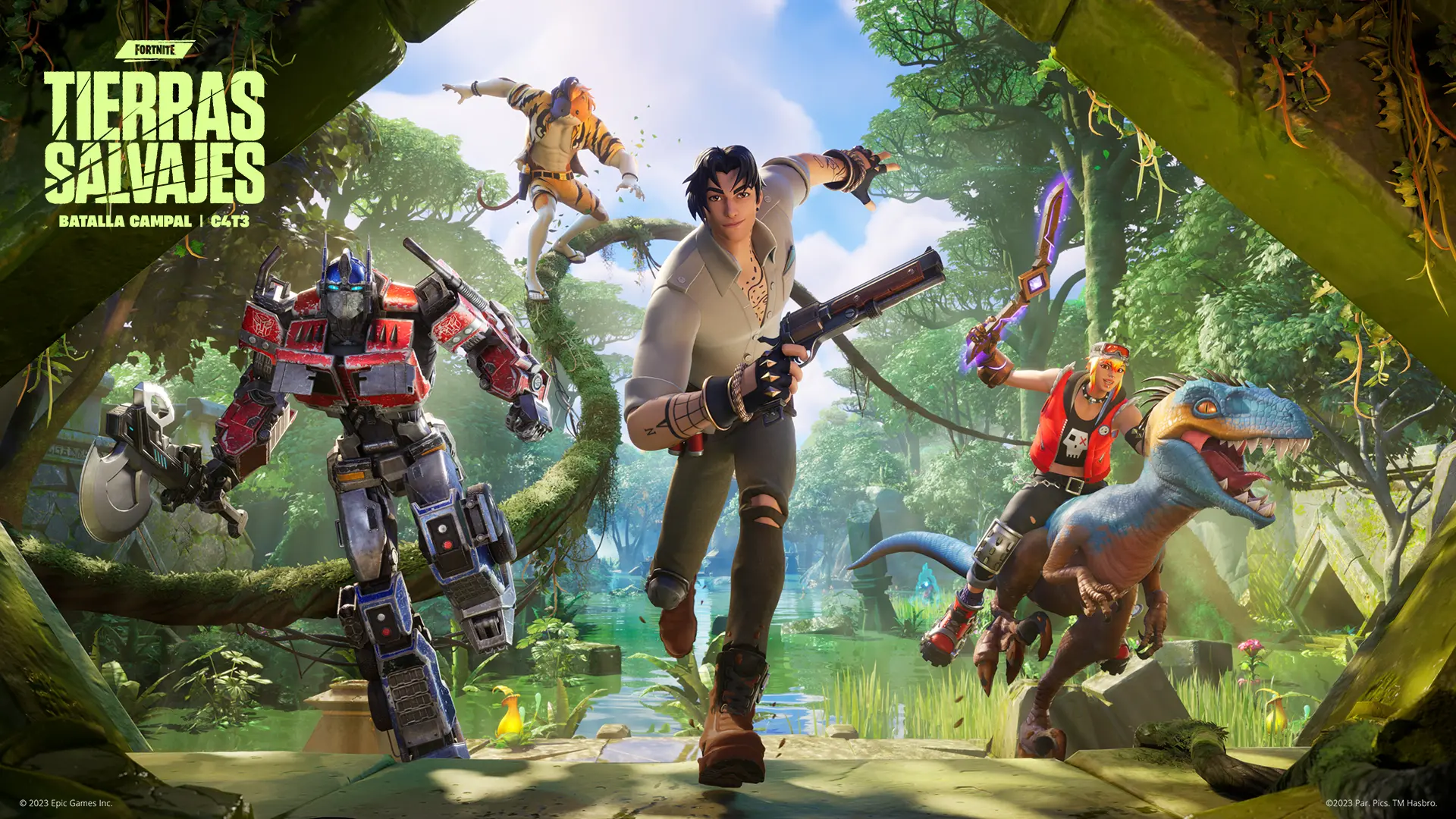 Asciende a las copas de los árboles, monta en velocirraptors, lucha con la vegetación y deslízate por el lodo para ir más rápido y camuflajearte. En los nuevos atuendos del pase de batalla de esta temporada, a los personajes originales de Fortnite se les une Optimus Prime como desbloqueable de nivel 100.
