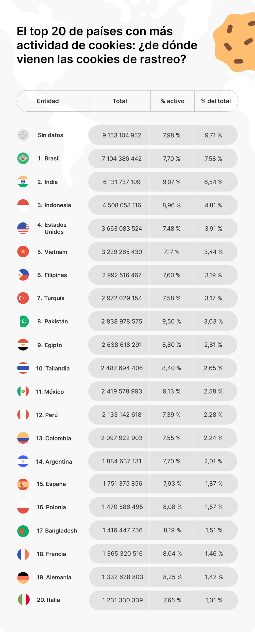 NordVPN ha realizado una investigación muy extensa de cookies que circulaban por la dark web. Dando como datos que México ocupa un lugar preocupante en el ranking global de cookies filtras, al posicionarse en el puesto 11 de 253 países. De las cuales 221 millones siguen activas y vinculadas a la actividad de los usuarios, así provechando la vulnerabilidad de tu navegador.