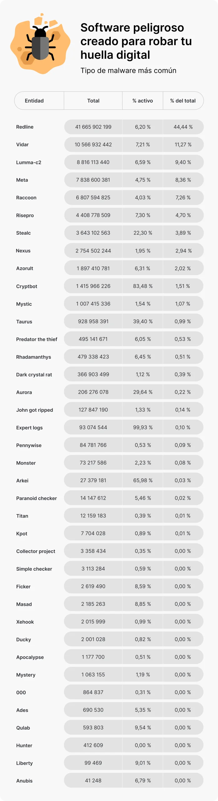 Los datos se recopilaron usando 38 tipos diferentes de malware, más del triple de los 12 tipos identificados el año pasado. Las variantes más activas fueron Redline (41.600 millones de cookies), Vidar (10 mil millones) y LummaC2 (9 mil millones). Estas familias de malware son conocidas por robar datos de acceso, contraseñas y otra información sensible.