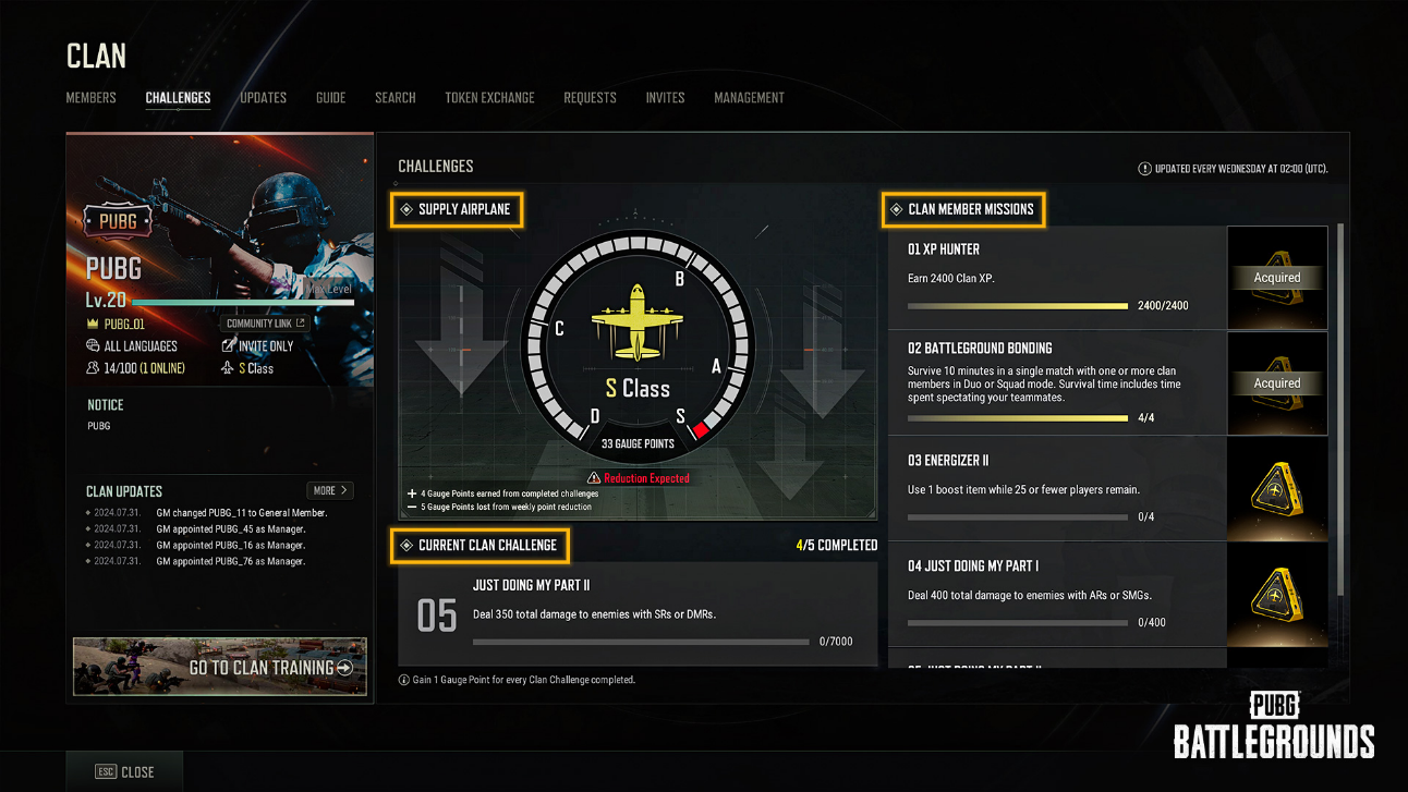 Ahora los clanes pueden disfrutar de Desafíos de clan y Misiones de miembros de clan semanales, los cuales proporcionan nuevas formas de participar y ganar recompensas en el juego. Al completar estos desafíos juntos se obtienen Puntos Calibre, que determinan la clase del avión de suministros del clan. Cuanto mayor sea la clase, mejores serán las recompensas de los nuevos botines de clan que se obtienen al completar las misiones de los miembros del clan. Los Puntos Calibre disminuyen ligeramente cada semana, por lo que es esencial mantener una alta actividad.
