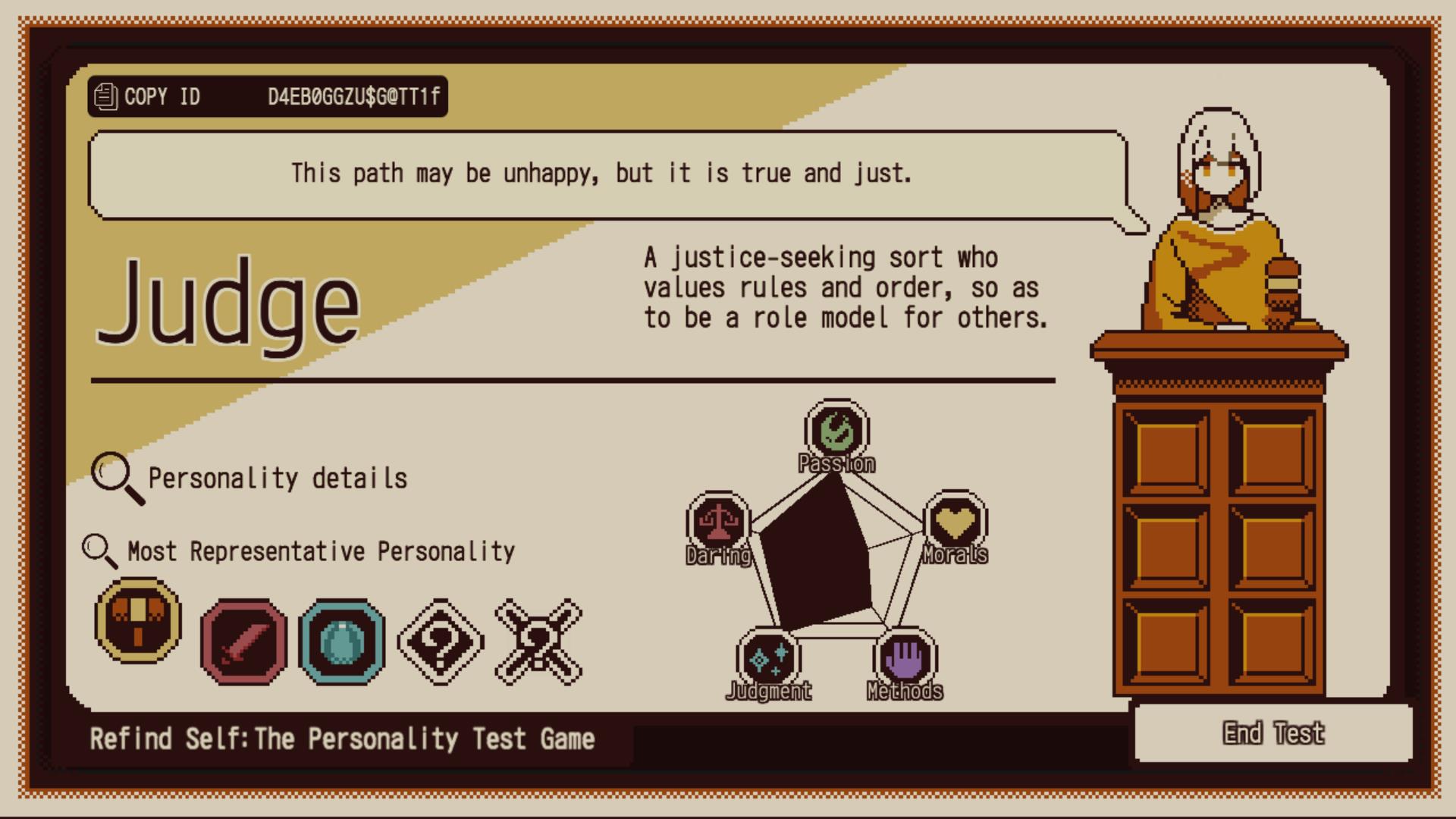 Tu diagnóstico revela un total de cinco rasgos diferentes. El primario que más te representa, dos complementarios, uno oculto y uno distante de tu forma habitual de ser. Hay 23 arquetipos de personalidad estilo RPG y el juego determina los cinco más cercanos a ti. Cada partida dura una hora y completar tres vueltas revela un diagnóstico completo. El juego está diseñado para que todos puedan disfrutar de la experiencia mientras ven la conclusión de esta historia.
