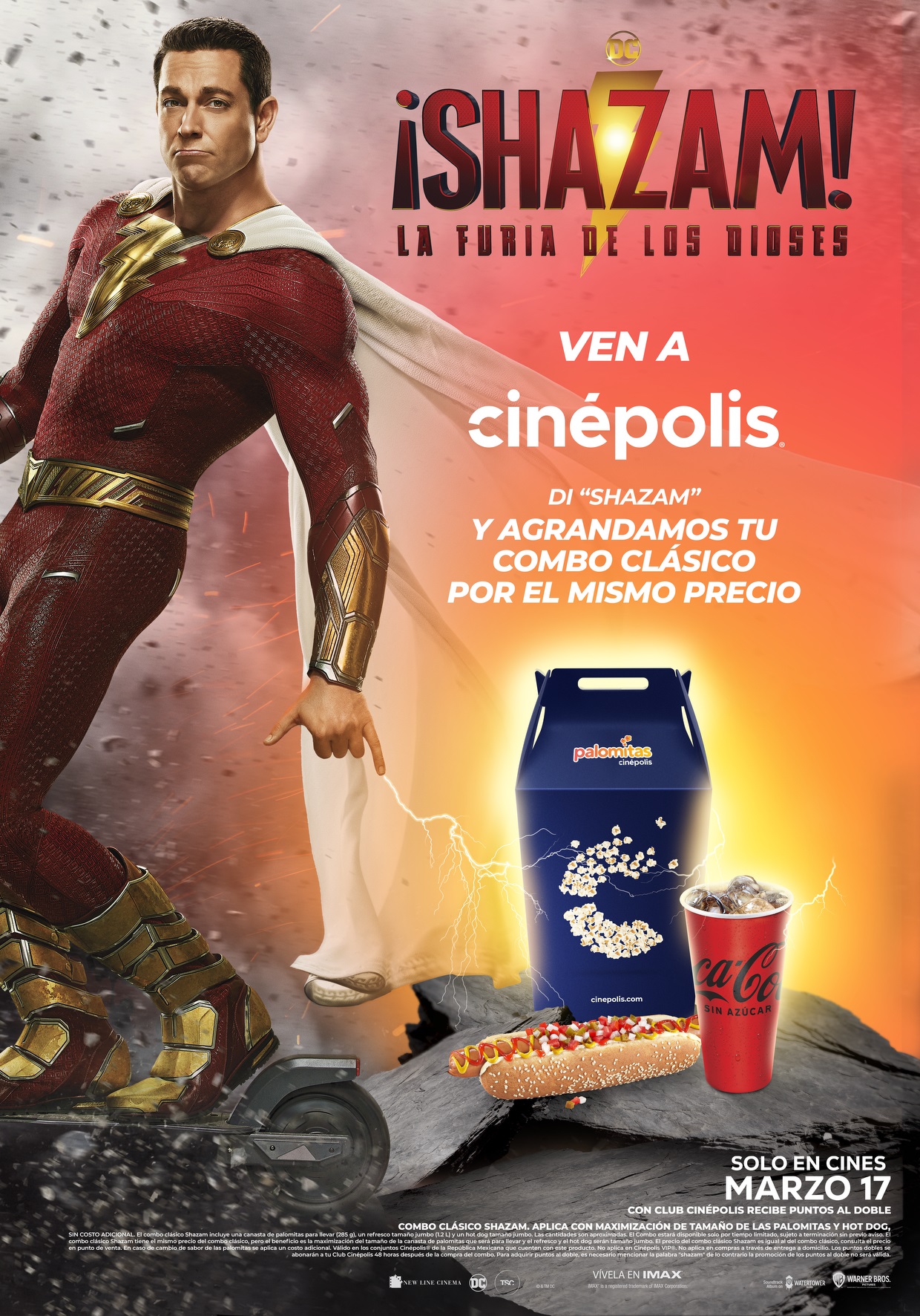 Todos los visitantes de Cinépolis podrán usar su magia para agrandar su combo clásico por el mismo precio. ¿El secreto? Sólo debes decir «Shazam» cuando pidan su combo en dulcería y así como Billy y su familia se transforman en superhéroes al invocar los poderes de los antiguos dioses. La promoción será válida para formato tradicional y salas VIP y estará disponible a partir del 9 al 29 de marzo.