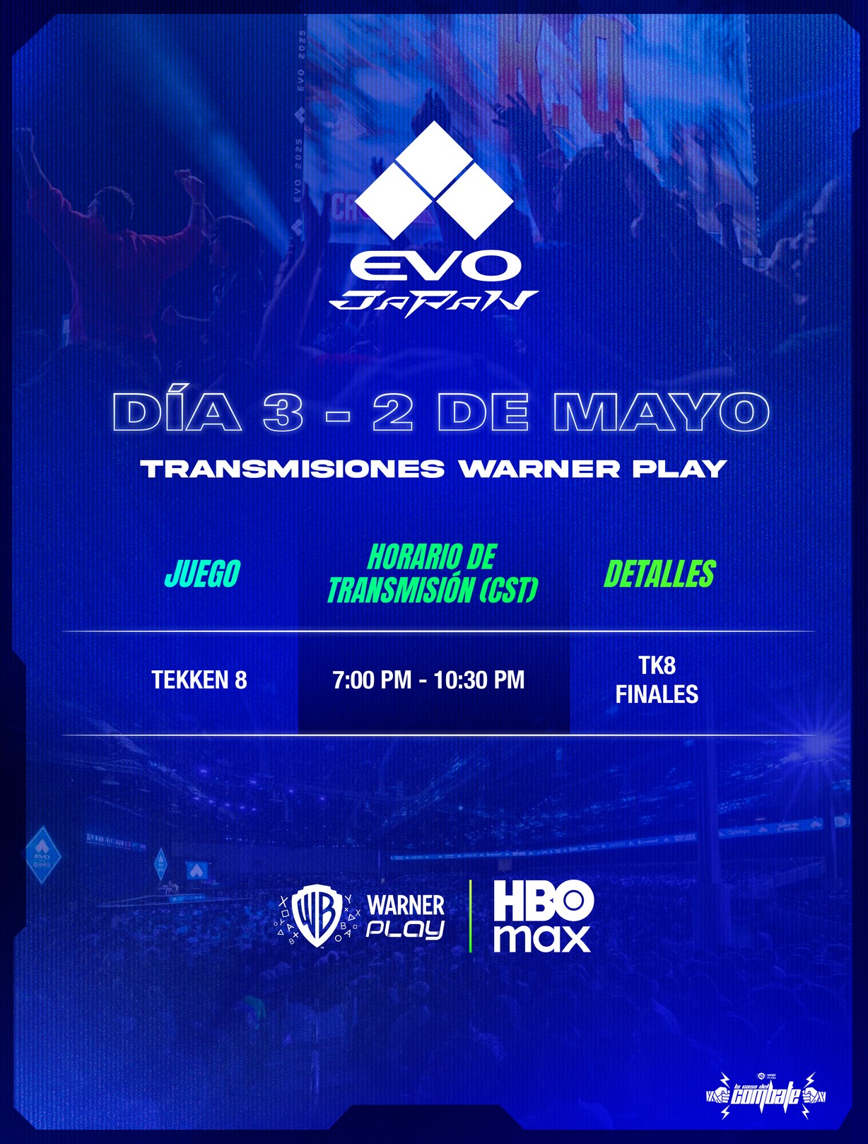 Mediante Warner Play tendremos una transmisión en español de las ediciones de EVO para Japón, Estados Unidos y Francia.